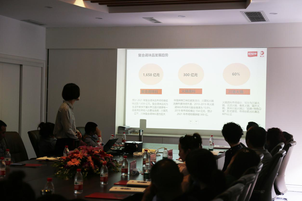 結(jié)束完參觀以后,嘉賓們來到會(huì)議室,由市場(chǎng)部劉經(jīng)理講解當(dāng)前復(fù)合調(diào)味品發(fā)展趨勢(shì),并結(jié)合趨勢(shì)及公司的發(fā)展優(yōu)勢(shì),發(fā)布近期公司推出的佐餐醬、紅油拌菜料、火鍋底料、魚調(diào)料等系列新品。